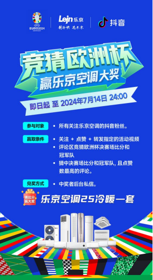 即日起至2024年7月14日24:00,樂京空調抖音官方賬號推出送禮活動——【樂京空調歐洲杯,競猜比分贏空調】,人人有機會領取價值不菲的樂京空調25冷暖一套!