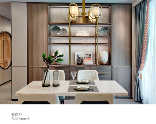 餐邊柜高柜門板采用德魯尼自主研發(fā)的新款連門型制作。金色鋁合金邊框加腰線一體式拉手可以使用2.4米長度板材制作出3米高的門板,保證門板不變形的同時(shí)節(jié)省拉直器成本。