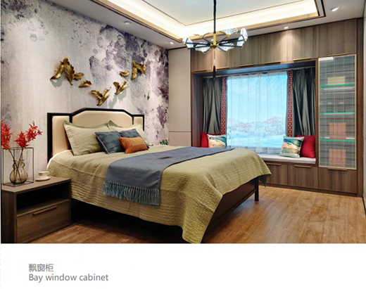 飄窗柜與床頭柜沿用了整體套系的設(shè)計(jì)語言。飄窗柜頂部大容量吊柜可收納過季衣物、床品,與開放式衣帽間配合使用更佳。