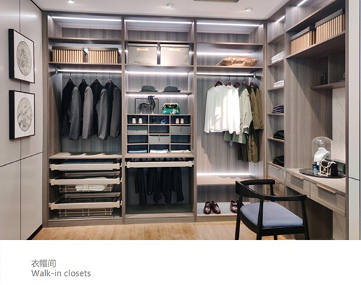 L型的全開放式衣帽間提供了強(qiáng)大的儲(chǔ)物空間,能夠高效的展示出常穿的衣物、手袋、皮包、鞋子等,視野開闊,一目了然。