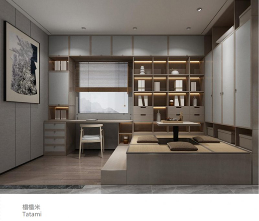 榻榻米借鑒了日式和室空間的設(shè)計(jì)理念。布紋芯板和深色木紋邊框組成了包覆拼框門型,溫馨典雅;新款方環(huán)形拉手小巧精致。