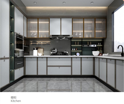 櫥柜整體采用U型布局,儲(chǔ)藏區(qū)、備菜區(qū)、烹飪區(qū)動(dòng)線流暢;門板采用布紋芯板窄邊框包覆門型,吊柜搭配金色布紋玻璃門。