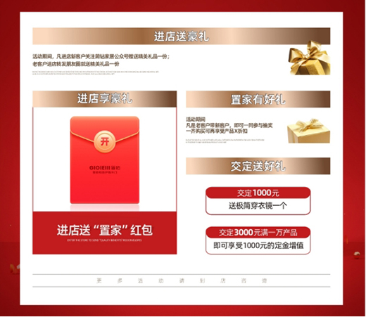 系列套餐鉅惠活動霸氣來襲,衣櫥柜套餐、門墻柜一體定制套餐等鉅惠套餐應有盡有,價格優惠之余,簡鉆還為你推出多重讓利政策。(活動詳情請以簡鉆全屋定制家居門店為準)