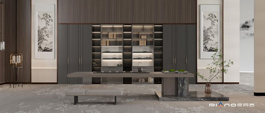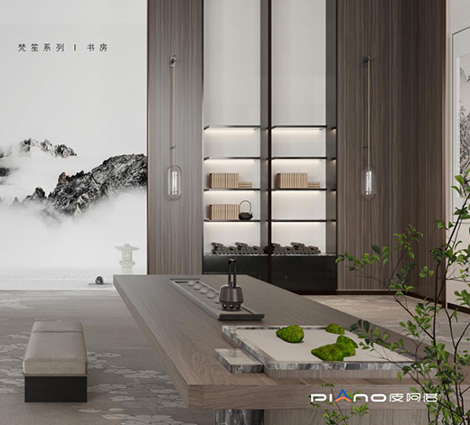 高端全屋定制皮阿諾「梵笙」系列將茶香從古代搬入現代生活,它將茶文化寫入設計中。從布局到陳列,都讓現代書房延續出人的文雅風范,彰顯家居主人優雅復古的個性品味。
