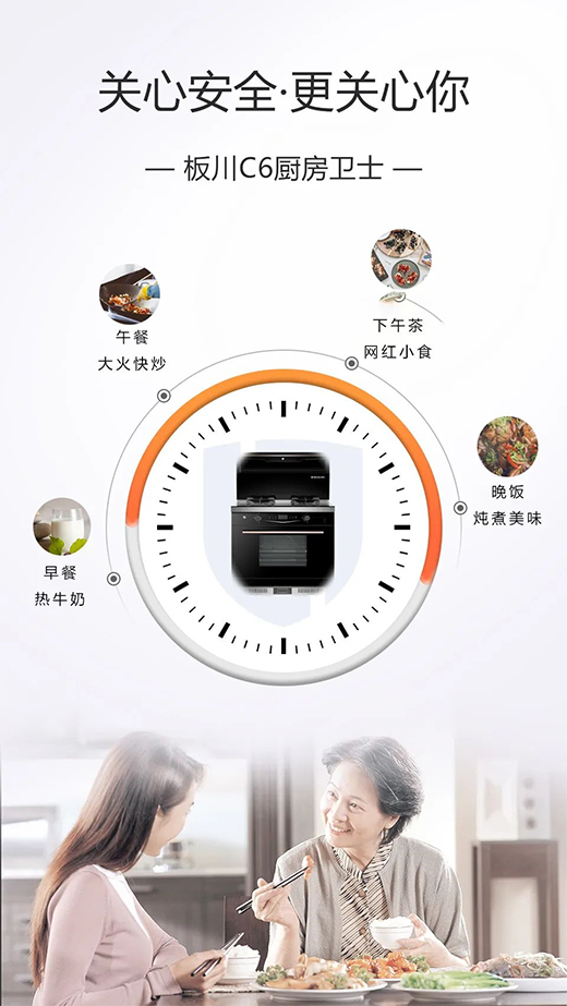 板川從大多數消費者實際生活需求出發,帶來全新的安全集成灶產品——C6廚房衛士。在板川安全集成灶安全屬性的加持下,最大化滿足了各種廚房日常所需功能,大火力、大風量、大吸力……當然,最重要的還是: