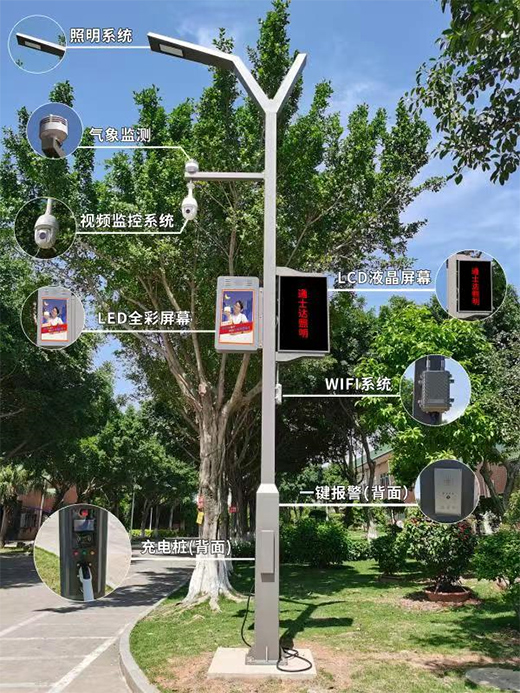 ▲通士達多功能智慧燈桿包含了照明系統、充電樁、信息發布屏、一鍵報警等多項功能。