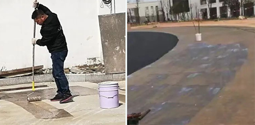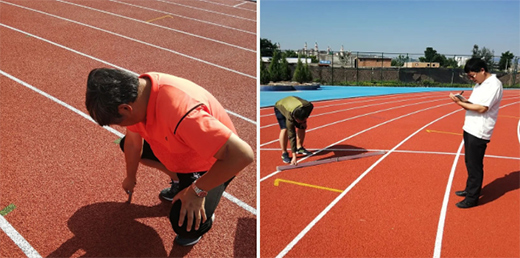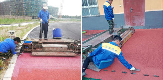 基層處理 → 底涂涂布 → 底層配料和攪拌 → 底層攤鋪 → 固化 → 面層配料和攪拌 → 面層噴涂→ 固化 → 測量劃線 → 檢測點線 → 竣工驗收交付。