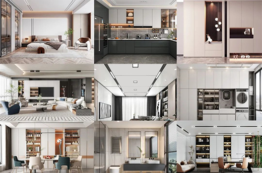 家里面大到衣柜、櫥柜、鞋柜,小到電視柜、陽臺洗衣柜,以及護墻板、吊頂都可以實現同色系搭配,顏值更高。