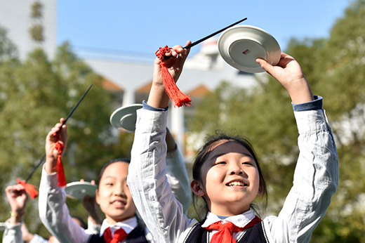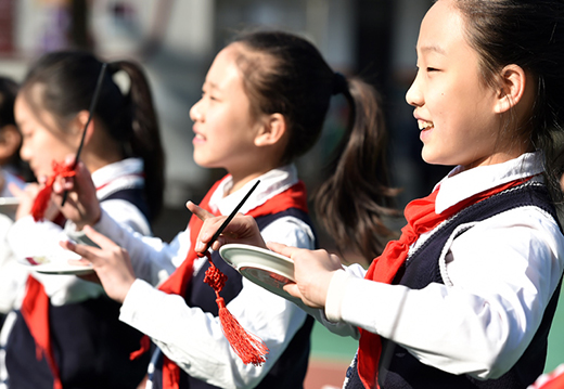 揚州市汶河小學校園藝術團的孩子們在用筷子和盤子作為打擊樂器,表演地方特色非遺項目“揚州清曲”。