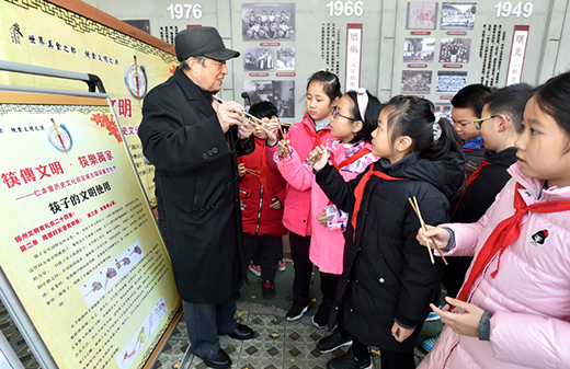 筷子民間收藏者胡學明老人正在揚州市汶河小學向孩子們介紹筷子的文明使用方法。