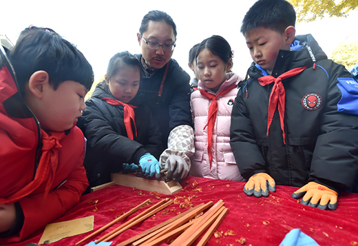 揚州市汶河小學的孩子們在筷箸文化節上學習體驗手工制作筷子的傳統木工技藝。