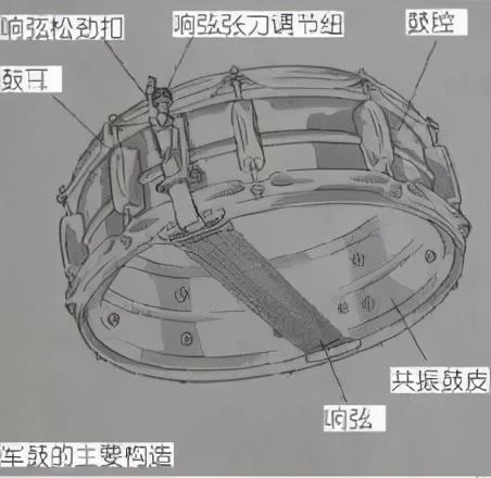 在交響樂隊、行進的軍樂隊和爵士樂隊中廣泛使用。軍鼓的型號千差萬別,其直徑和深度亦不相同。敲擊那一面的頂部被稱為敲擊膜;底部由繃在皮面上的響弦(由一串羊腸、尼龍或鋼絲制成的弦)組成,稱為響弦面。擊敲鼓面時,響弦面的弦發生共振,產生格格的響聲。音質可通過將弦擰松而改變,使鼓發出低沉、暗淡聲音;也可在敲擊面上放一塊布,產生弱音效果。用兩個木制、膠合木或金屬制成的鼓槌演奏。由鼓槌所獲得的特殊效果有滾奏、快速裝飾音等。