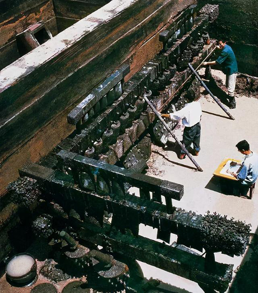 一副是敲劍鼓,另外一副則是撞擊編鐘。也就是說,想要編鐘發(fā)出美妙的音樂得用專門的敲劍鼓來敲它。不過盡管有圖案作為參考,考古人員也在墓中找到了配套的工具,但是誰也不敢輕舉妄動。