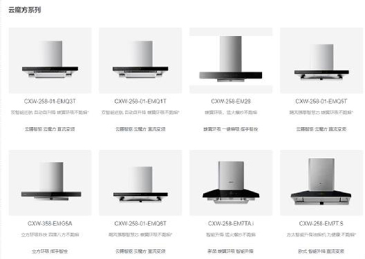 拿云魔方系列的 8 款油煙機舉例,如果把做這些油煙機型號和關鍵詞遮住,一眼望去,縮略圖上的油煙長得差不多,很容易出現前文提到了實體店混淆產品功能的情況。