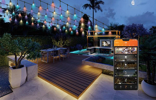 5、當賓客來訪,可以通過手機遠程一鍵開啟“迎賓模式”,燈光輕柔的隨著音樂等協調工作,營造溫馨浪漫的庭院氛圍。