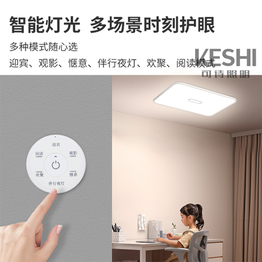 據照明工程學報《光與健康的研究動態與應用前景》所言,不同燈光色溫使人產生不同的情緒,進而影響人的學習活動效率。傳統的吸頂燈在調節燈光色溫亮度上稍有欠缺,但這款ALED全光譜護眼客廳吸頂燈產品配備遙控器,方便用戶開關燈及選擇切換不同的燈光模式,包含迎賓、觀影、愜意、歡聚、閱讀、伴行夜燈六種模式,隨心所選,更適應日常生活的實際色溫光照需求。