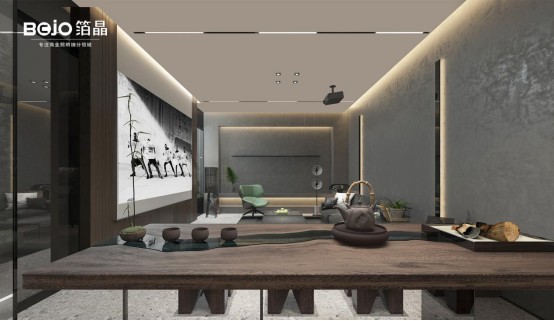 以茶待客的辦公區(qū),則是一片寧靜與雅致。局部采用箔晶照明的明裝筒燈,為工作區(qū)域提供了充足的光線;同時(shí)搭配線性照明,光線透過室內(nèi)的綠植,灑在墻面上,形成了一幅唯美的畫面。這不僅營造了一個(gè)舒適的工作環(huán)境,更讓來訪的客人感受到一份格調(diào)與韻味。