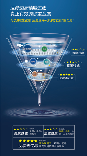 長效反滲透濾芯是A.O.史密斯商用凈水的核心專利,能夠有效濾除水中病細菌、病毒、余氯、重金屬離子、抗生素等有害物質。
