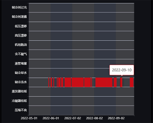 包括制冷劑泄漏、冷凝器結垢、液管堵塞、機組跑油、壓縮不良等。通過提前預警及準確定位,減少主機異常停機。