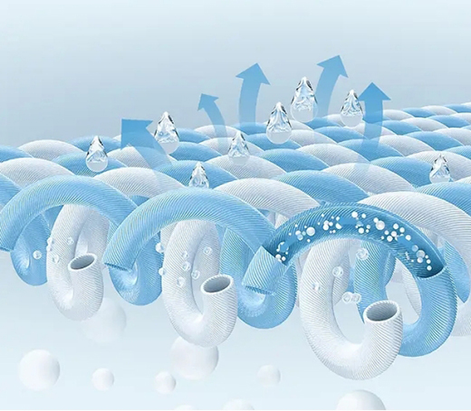 它通過獨特的四孔纖維結構,構建出水汽循環對流,四面環氧,舒爽透氣。并且經過COOLFX技術處理,利用纖維的溝槽產生虹吸作用,可以帶動肌膚表面的水分快速擴散,吸收汗液水分,排濕散熱速度更快,促進人體自然的溫度調節,使肌膚始終保持干爽舒適。