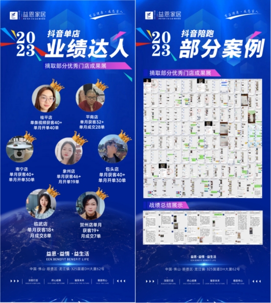 2023年以來,益恩家居總部開展了“抖音同城長期陪跑班”培訓,活動開展以來取得了巨大成效。因此,在此次展會上益恩家居展示了眾多經銷商抖音賦能的成功案例。這些成功案例不僅展示了益恩家居與經銷商的合作成果,也為其他經銷商提供了寶貴的經驗和啟示。