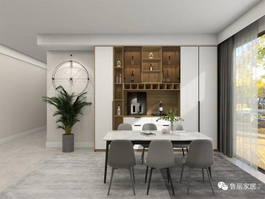 白色門板搭配原木色柜體,整體質(zhì)感出眾又簡(jiǎn)約。白色餐桌與灰色餐椅做搭配,與后方的餐邊柜一致搭配,讓整個(gè)餐廳都溫暖起來。