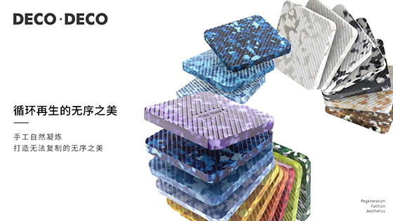 全新推出最新研發的DECO?DECO 再生魔石系列,在工藝上貫徹循環再生的理念,采用可回收的環保材料進行循環利用,進一步提高了其可持續發展性,生成色彩繽紛、質感豐富的全新材料,表面呈現收放有度的呼吸感,結合樹脂玻璃優越的透光性,無序之美的手工自然凝煉,表現出色彩與圖案獨特的藝術感,帶來“魔石”般的效果。