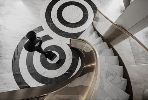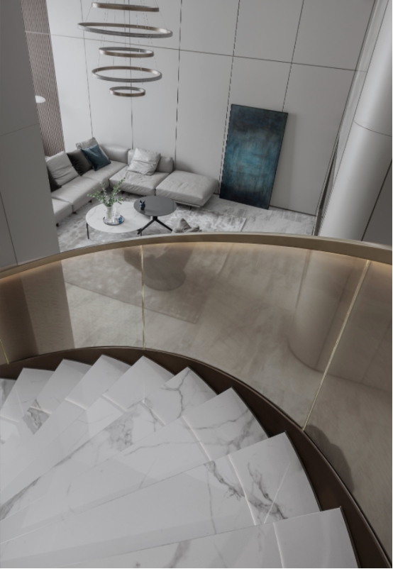 “金屬+夾絲玻璃+魚肚白巖板”明媚、奢華