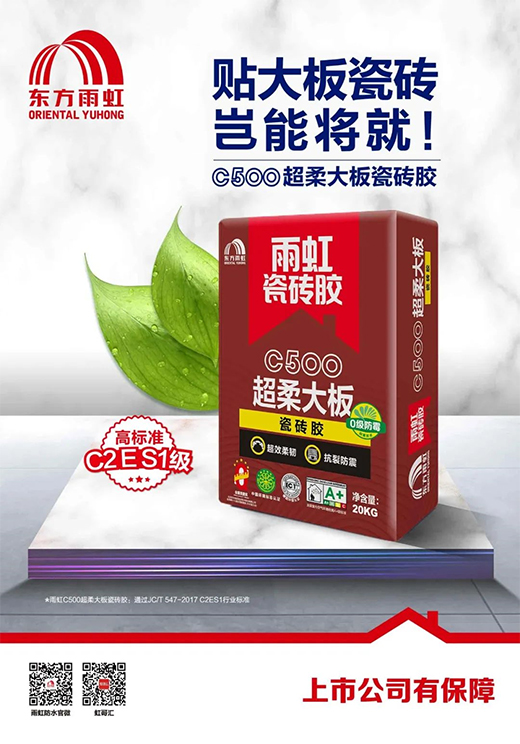 雨虹C500超柔大板瓷磚膠具有超強粘結力度,其拉伸粘結強度可達1.9Mpa(兆帕),極大程度保證了大板瓷磚鋪貼的安全性。安全的同時兼具環保,雨虹C500超柔大板瓷磚膠通過了歐洲最嚴格的的EC1plus環保認證,高度環保,關愛每一刻居家生活。