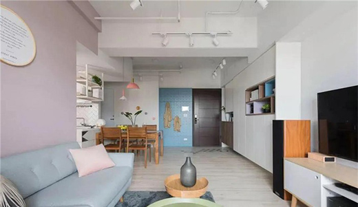 小戶型也是十分適合打造浪漫氛圍的戶型,進入客廳我們看到的仍然是北歐風的簡約氣質,在這里我們看到浪漫與簡約毫不沖突。客廳沙發背景墻選擇用貝殼粉藕粉色進行裝飾,貝殼粉細膩的質感讓整個裝修看起來更加高級。