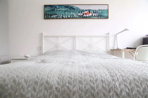 次臥沒(méi)做過(guò)多的裝飾,墻面用了簡(jiǎn)簡(jiǎn)單單的白色,搭配白色鐵藝床具,整體看起來(lái)時(shí)尚干凈。