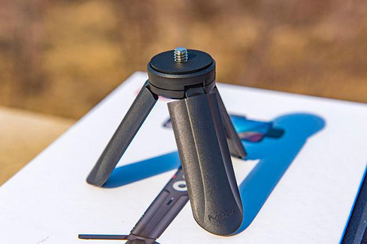 底部單獨配置的三腳架很小巧,螺紋接口與通用三腳架一致為1/4螺紋口,不但能夠在手持云臺穩定器上使用,即使是單反微單也都通用,三腳架放置在地面上可以解放雙手,設計出獨特的拍攝動作,比如當前的vlog視頻創作者很多時候要自拍,然后展示一些有故事性的場景,很多時候一個手拿著手機有些不便操作,有三腳架就會方便很多。