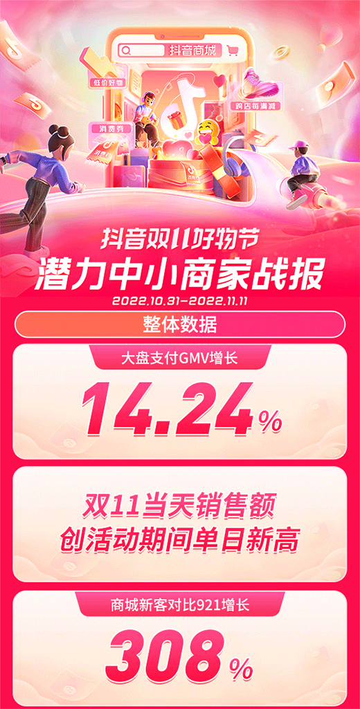 雙11期間,潛力中小商家大盤支付GMV增長14.24%,雙11當天銷售額創活動期間單日新高,商城新客對比921增長308%。
