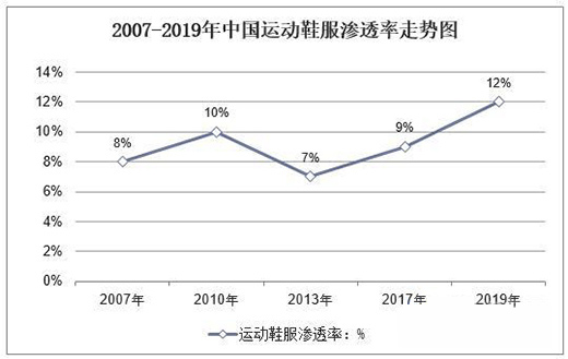 目前國內運動鞋服的滲透率(運動鞋服市場規模/整體鞋服市場規模)持續提升,2019年達12%,但對比全球其他市場,滲透率仍有提升空間。
