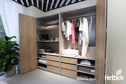 德國海蒂詩(廣州)體驗中心展示了如何通過大型移門折疊門的設(shè)計讓普通衣柜變聲衣帽間,將Fascin[action]解決方案中“享受舒適”化為了切身體驗