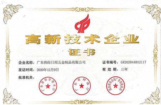 今年年初,廣東偉經(jīng)金屬、廣東偉經(jīng)家居榮獲廣東2021第三批高新技術(shù)企業(yè)認(rèn)證。獲得國家在高新技術(shù)領(lǐng)域重點(diǎn)支持,代表著廣東偉經(jīng)集團(tuán)研發(fā)成果在國內(nèi)得到認(rèn)可,而這也是廣東偉經(jīng)集團(tuán)長期堅(jiān)持創(chuàng)新研發(fā)結(jié)出的碩果。