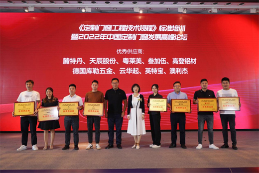 2022年9月1日,“《定制門窗工程技術規程》標準培訓暨2022年中國定制門窗發展高峰論壇”在佛山希爾頓酒店隆重舉辦。庫勒五金受邀出席,并在頒獎典禮現場榮獲“優秀供應商”榮譽!