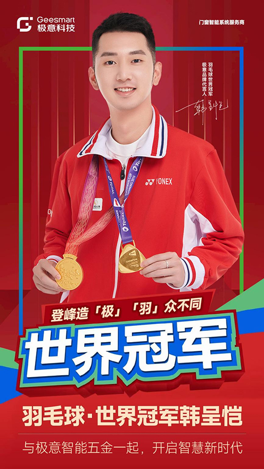 冠軍品質,冠軍代言!極意科技正式簽約羽毛球世界冠軍韓呈愷成為其品牌代言人。冠軍的加盟將給品牌的發展與布局注入全新力量,為極意智能五金系統品牌建設硬核賦能。