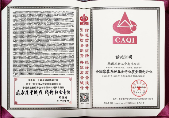 質(zhì)量決定一切,有好質(zhì)量,市場(chǎng)才認(rèn)可產(chǎn)品;有好質(zhì)量,企業(yè)才擁有誠信;有好質(zhì)量;企業(yè)才能夠脫穎而出!近日,我國開展“質(zhì)量月”活動(dòng)對(duì)廣大企業(yè)進(jìn)行質(zhì)量評(píng)選,其中庫勒五金榮膺“全國質(zhì)量誠信標(biāo)桿典型企業(yè)”;“全國家裝系統(tǒng)五金行業(yè)質(zhì)量領(lǐng)先企業(yè)”;“全國家裝系統(tǒng)五金行業(yè)質(zhì)量領(lǐng)先品牌”;“全國質(zhì)量檢驗(yàn)信譽(yù)保障產(chǎn)品”等多個(gè)榮譽(yù)。
