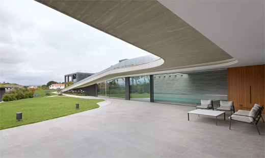 多功能公共空間,被一塊以混凝土澆筑板形的綠植屋頂所遮蔽,通過這一手段淡化了自然花園和建筑之間的界限,同時對這一空間做了半構造半切割的處理。