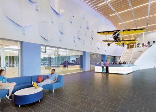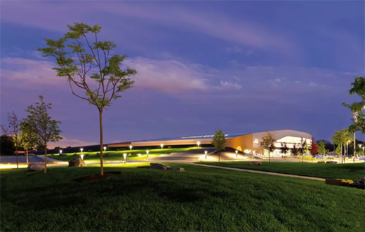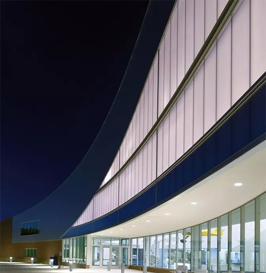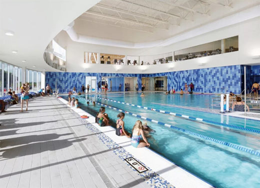 該建筑在平面上進(jìn)行了有機(jī)調(diào)整,進(jìn)一步遮蔽了進(jìn)入展館的廣場(chǎng),使來(lái)訪者在進(jìn)入建筑時(shí)能夠免受公路噪音和交通的影響。同時(shí),透明的立面展示了進(jìn)行健康和娛樂(lè)活動(dòng)的社區(qū)公共生活場(chǎng)景。泳池位于建筑南端的圓形場(chǎng)地,最大限度地享受陽(yáng)光。從總體上看,各種各樣的社區(qū)功能被整合在這個(gè)被抬升的景觀建筑的內(nèi)部和外部中。