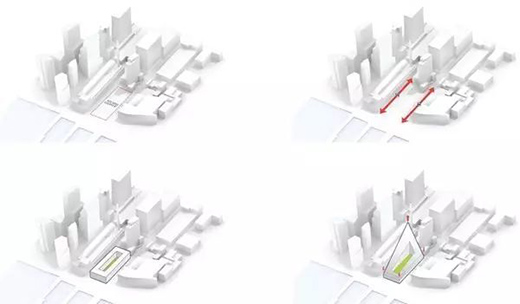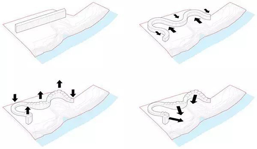 下面以BIG事務所兩個項目的設(shè)計過程的分析圖為例來說明,前后兩張圖雖然只有圖形,但是其表達的思路是相似的,慢慢來理解體會一下,發(fā)現(xiàn)其邏輯是清晰的,看過之后給人的態(tài)度也是明確的,其實每一個建筑的設(shè)計都應該是清晰明確的。