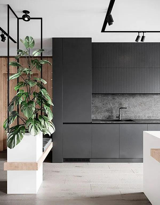 廚房位于客廳的后方,黑白色的臺式中島雙層設計,上方的白色吊燈又突出了整個空間的藝術氛圍,雅黑色的櫥柜在空間中進行相互融合,讓整個空間的層次氛圍越來越豐富。