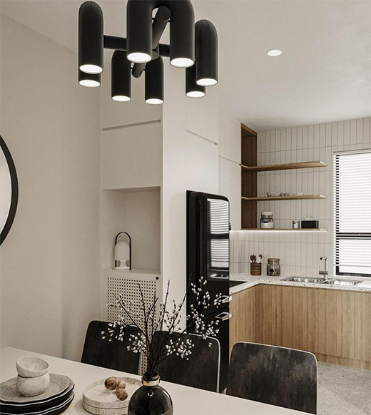 餐廳與L形廚房相連,天然木材和干凈的白色櫥柜帶來低調(diào)、雅致的美感。
