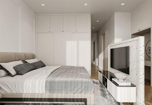 床的下方是圓形地毯環(huán)繞,并延伸到現(xiàn)代電視墻的單元下方。半個層高的電視墻將睡眠空間與更衣區(qū)隔開。