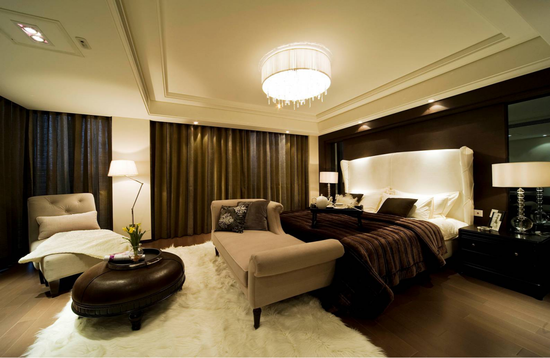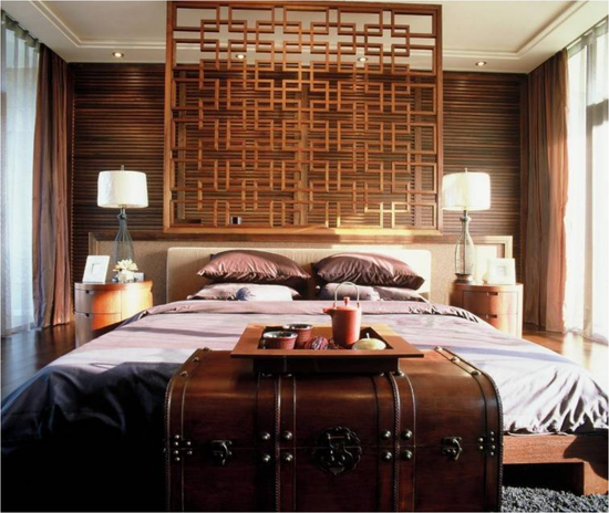 主臥房中間分了幾個層次,用了一些傳統中式圖騰的屏風,來界定幾個空間。走進來第一個洗手臺,往下走是臥房,在往后面走是更衣室。這里沒有完全用中式家具,只要是質感和我們的空間可以做成一個配合就可以的新式家具。