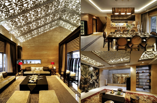 這是另外一套單獨的別墅,一方面是有了框景的手法,客廳和餐廳之間有個景的效果。用了一個類似植物來直接表達中式的感覺,內部形成一種形態,讓客廳和餐廳之間有進一步的溝通。