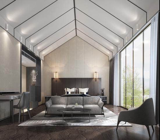 這套北京泰禾紅御別墅,這里最早是賣的二百多平單坡頂別墅,屋頂會顯得很小。設計的時候我們在窗簾上面做了個大鏡子,原來的在戶外看到的單坡頂在鏡子反射下來就變成是雙坡頂。所以來購房的人在外觀看這個是一個小別墅,但是進來發現這個和他原來的衡量的內部空間是有非常大的差異,給他相對震撼的效果,就對房型有特別的印象。