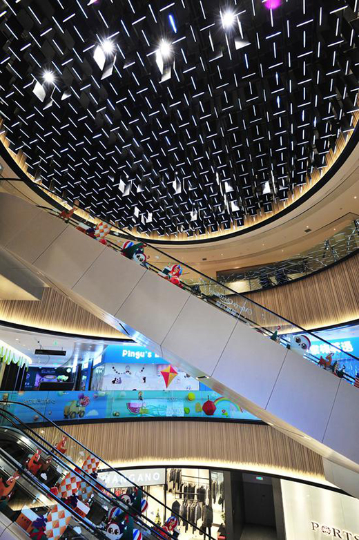 中空挑高空間縱深向對應的是透明的玻璃采光頂,引入自然光與內部燈光的互動。購物區域天花造型層疊有致,區別于明亮的商鋪室內燈光立意,點狀射燈將光源投射于天花的立體棋盤格造型之上,打造出了天花上光影交疊的靈動,不規則光影加重了幾何體塊交疊帶給人的視覺吸引,豐富層次的同時更添意趣。