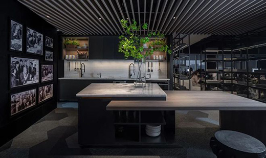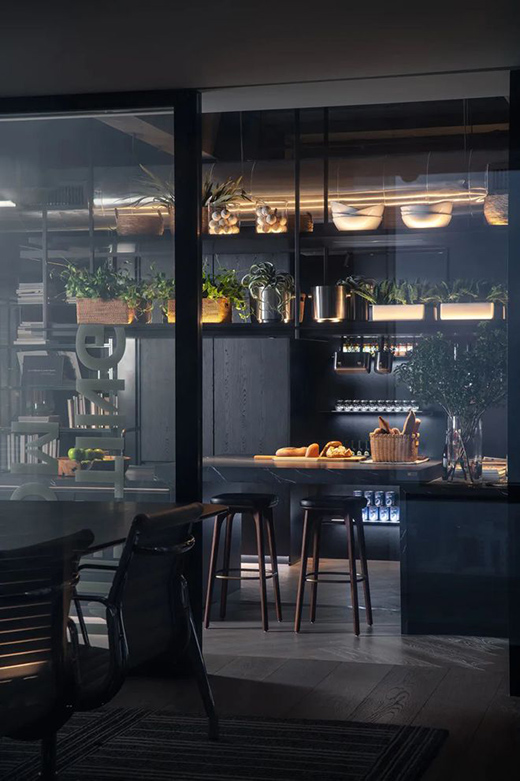 咖啡吧另一側的開放式廚房,將東方飲食禮儀納入其中,廚房中島可供吧臺小酌或冷餐用餐的情境設定,滿足不同的需求,展現空間的多元性。